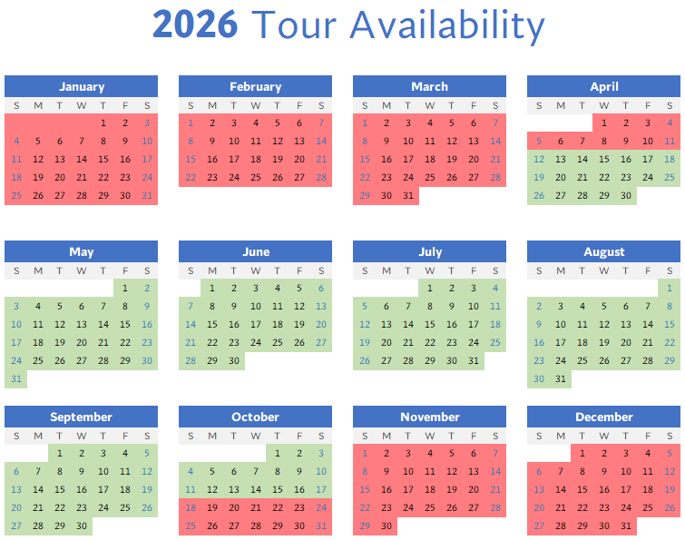 Calendar showing availability of guided tours.