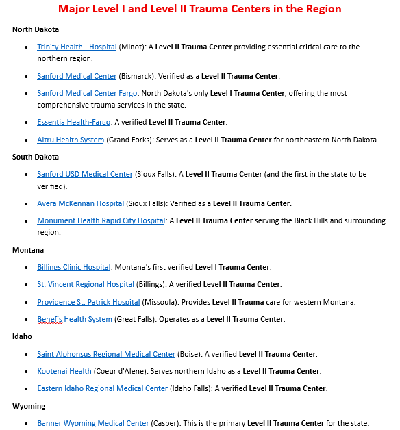 Maps below identify the Major Level I and II Trauma center locations in the Region. There are clinics in different areas, however for major medical please make note of the designated areas on the maps.